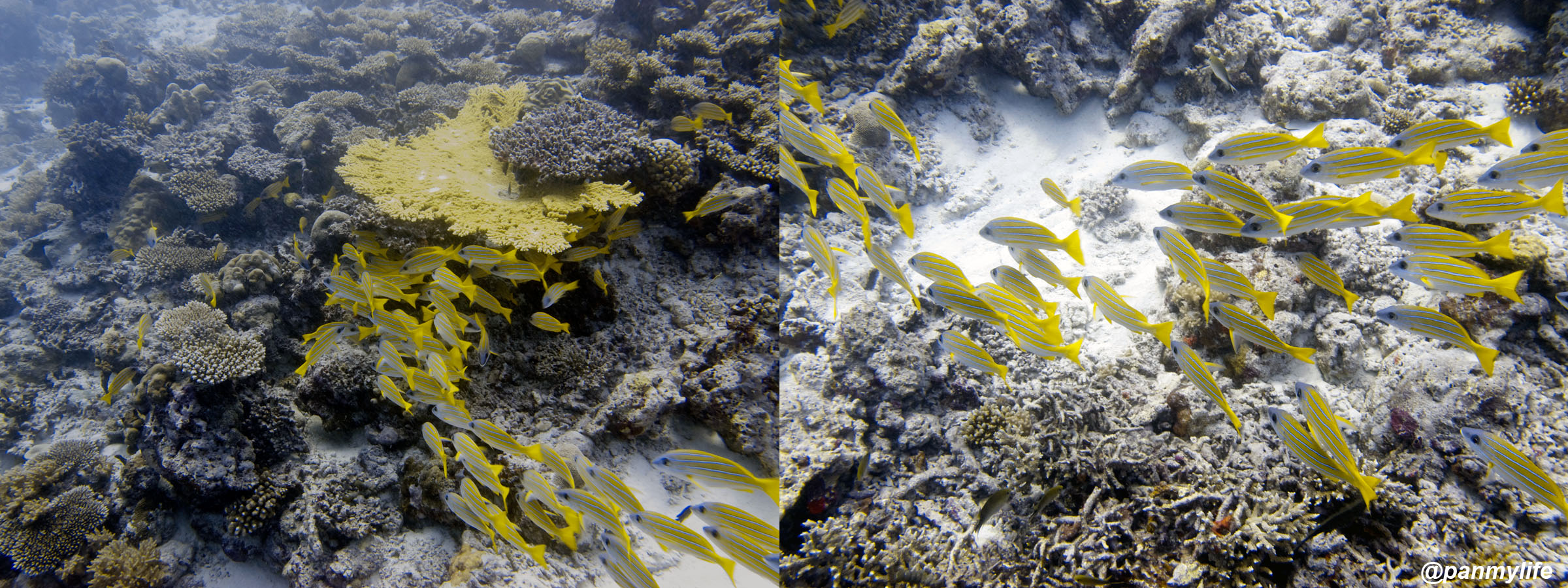 We did our safety stop above the thila that was filled with hard corals. I thought they looked bleached but was told that that was the colour they had always been. The occasional swarms of yellow fishes added some life and colour to this hard surroundings.