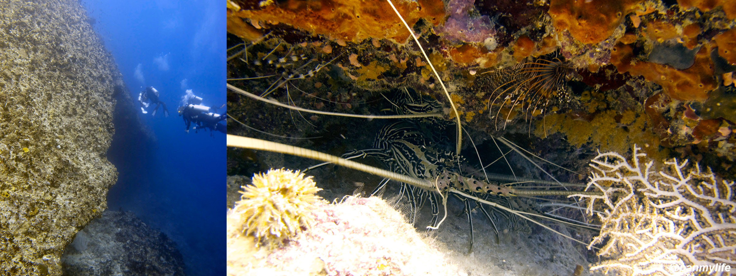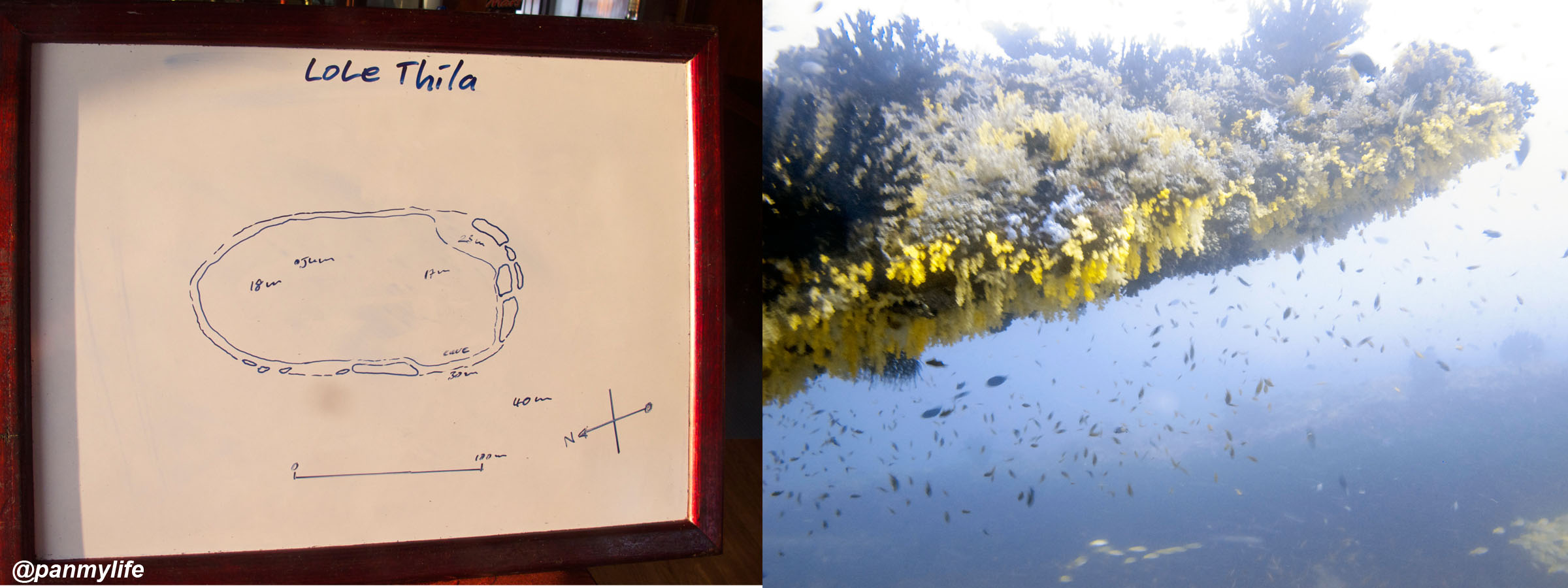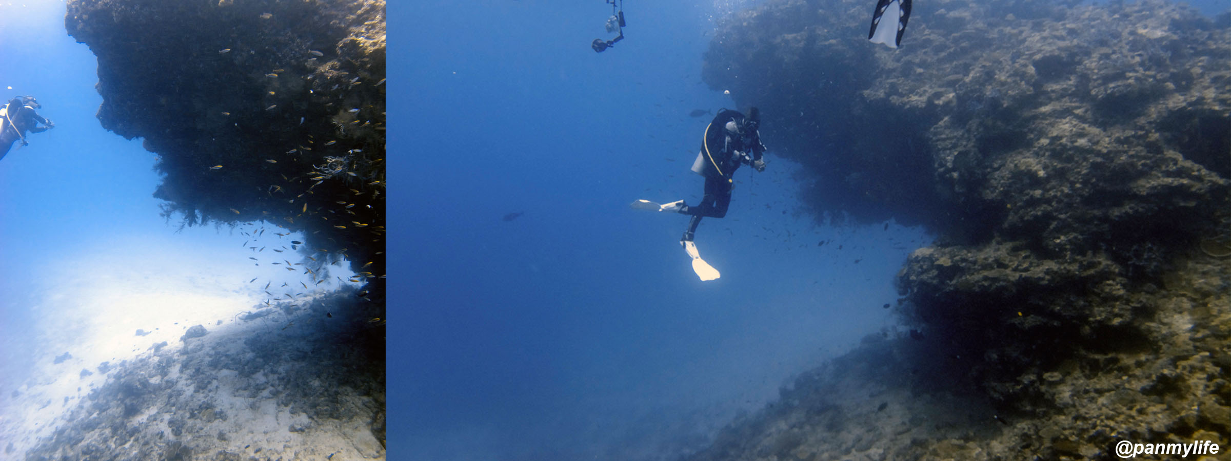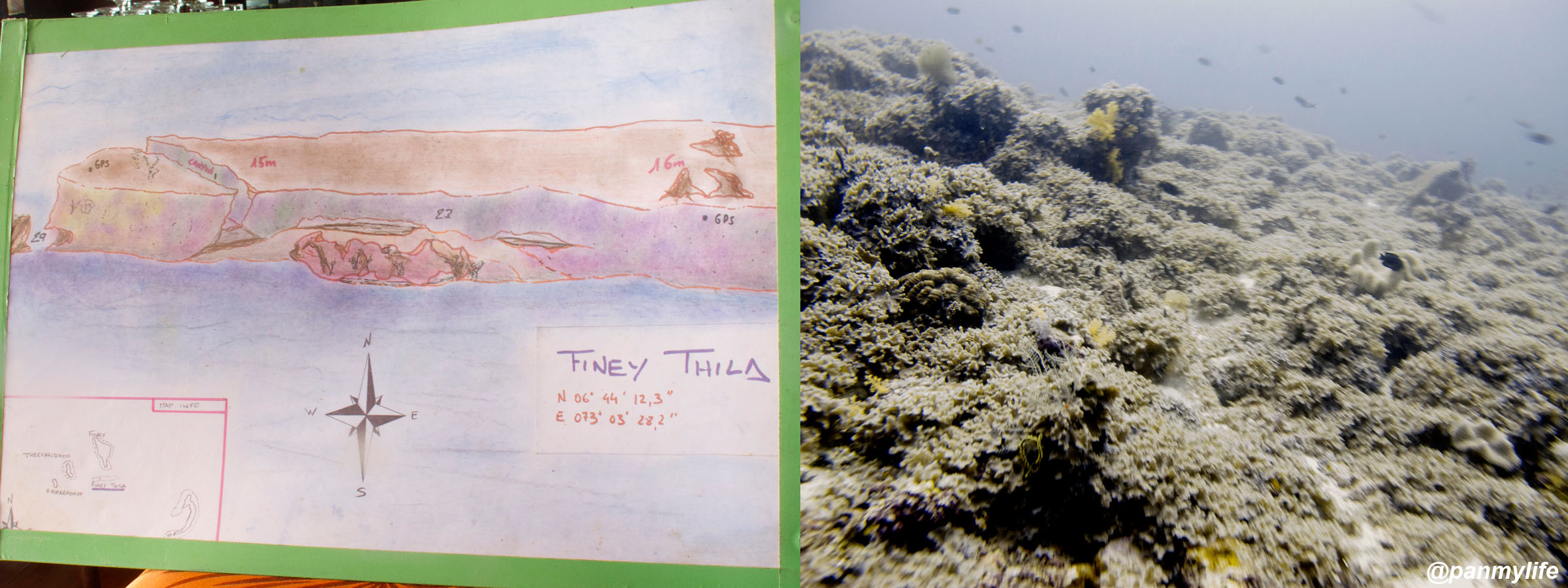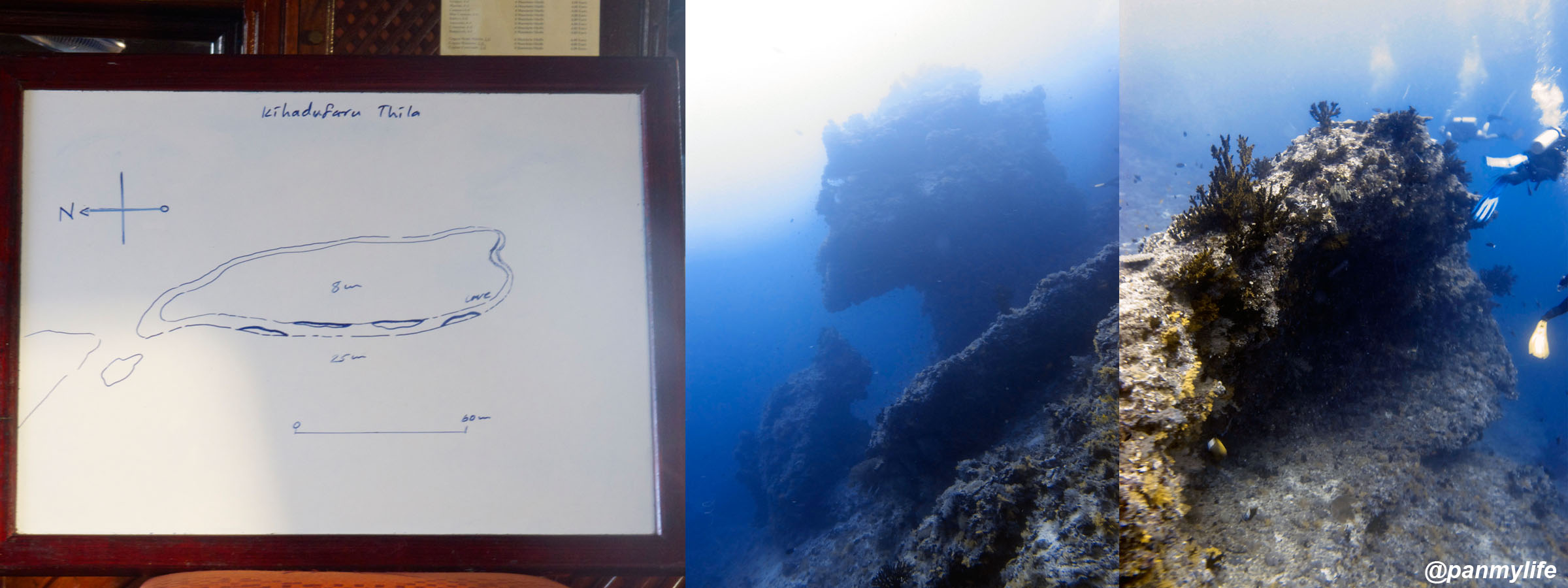 More thilas. The top was at 8m so we could dive around the top when we do our safety stop. The edges were lined with caves again.