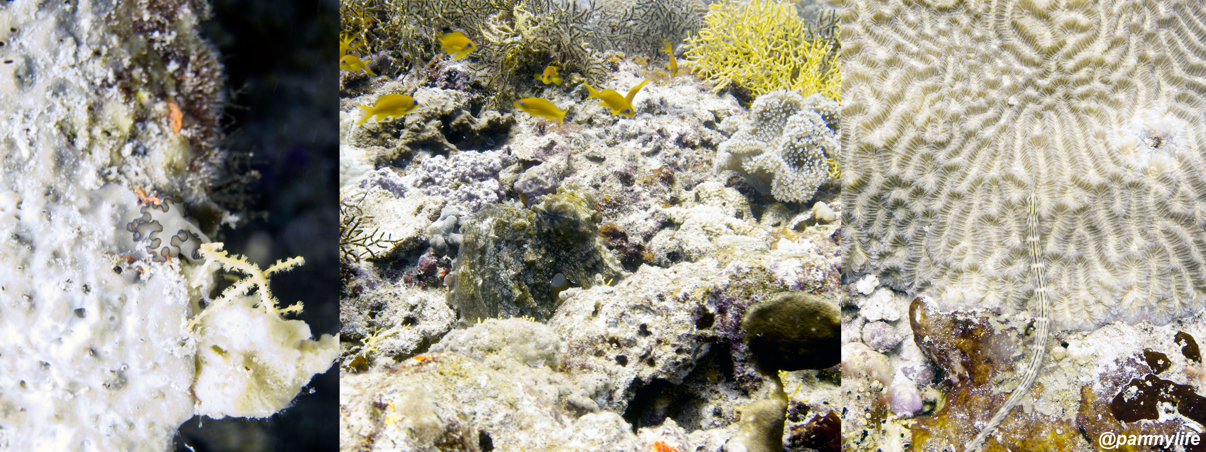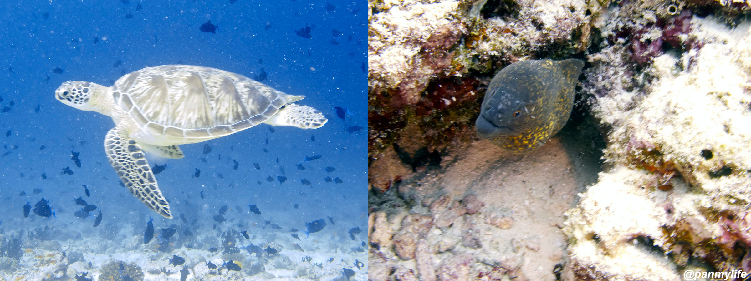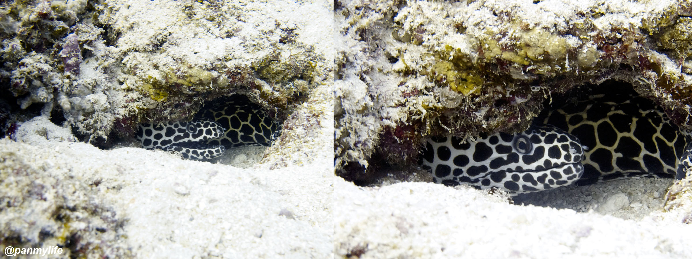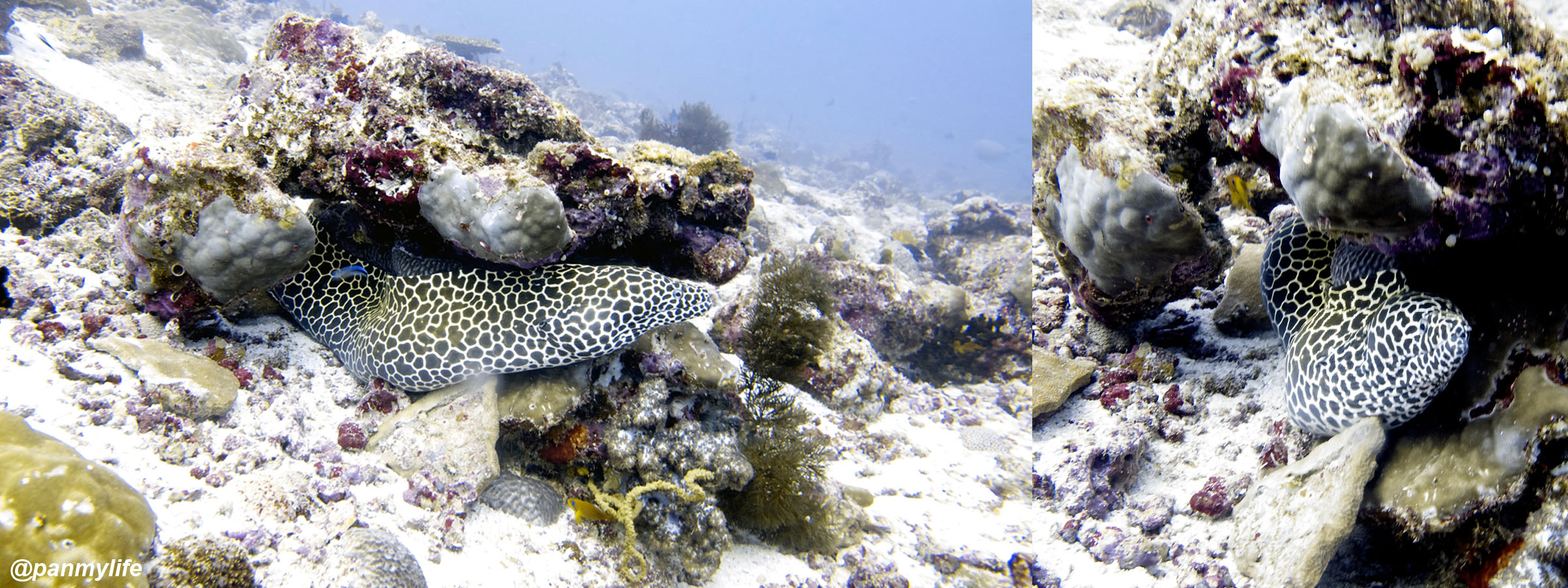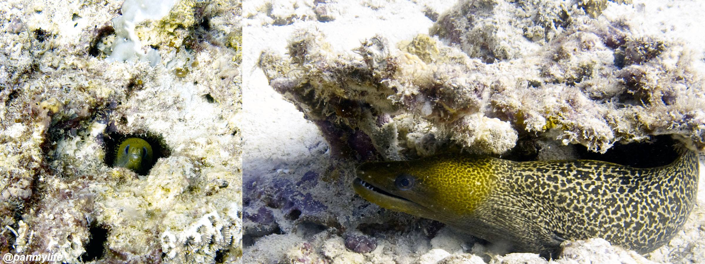 It seems that the conditions were not as predicted. The lack of current also meant no big fishes. It was a quiet and calm dive but there were some pretty creatures too. This was like a moray eel gallery. They were all over the place and all in different colours too.