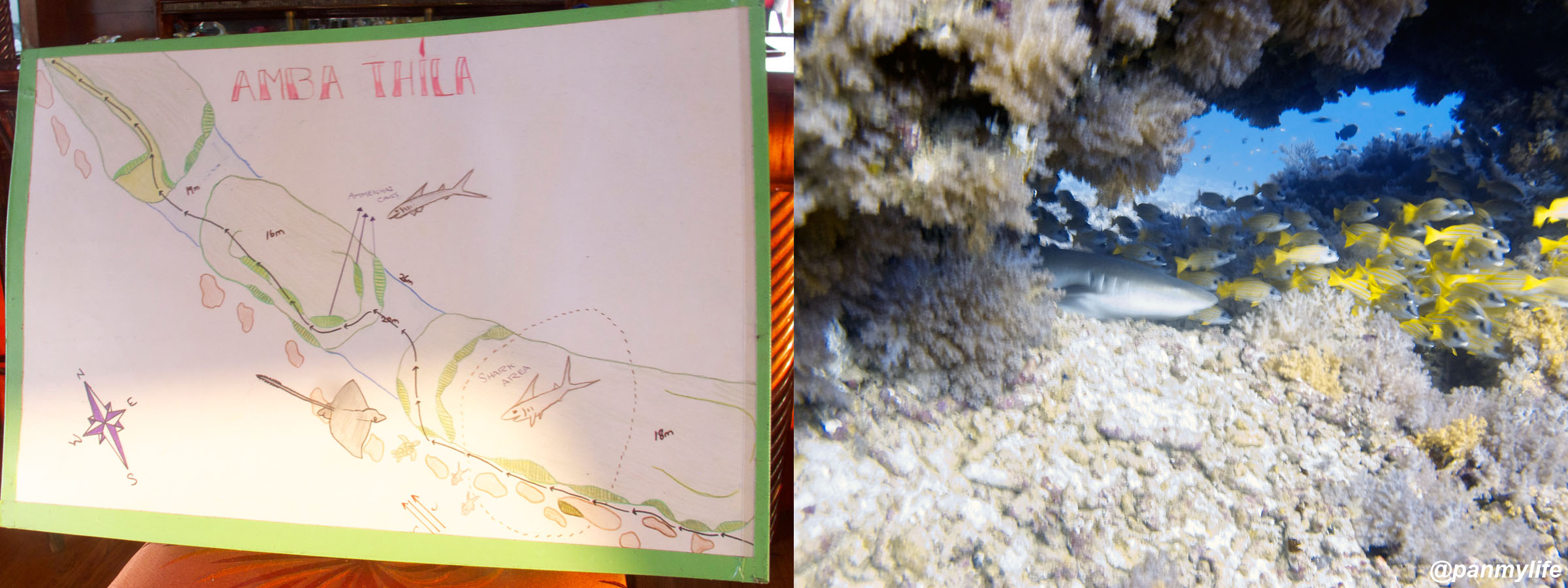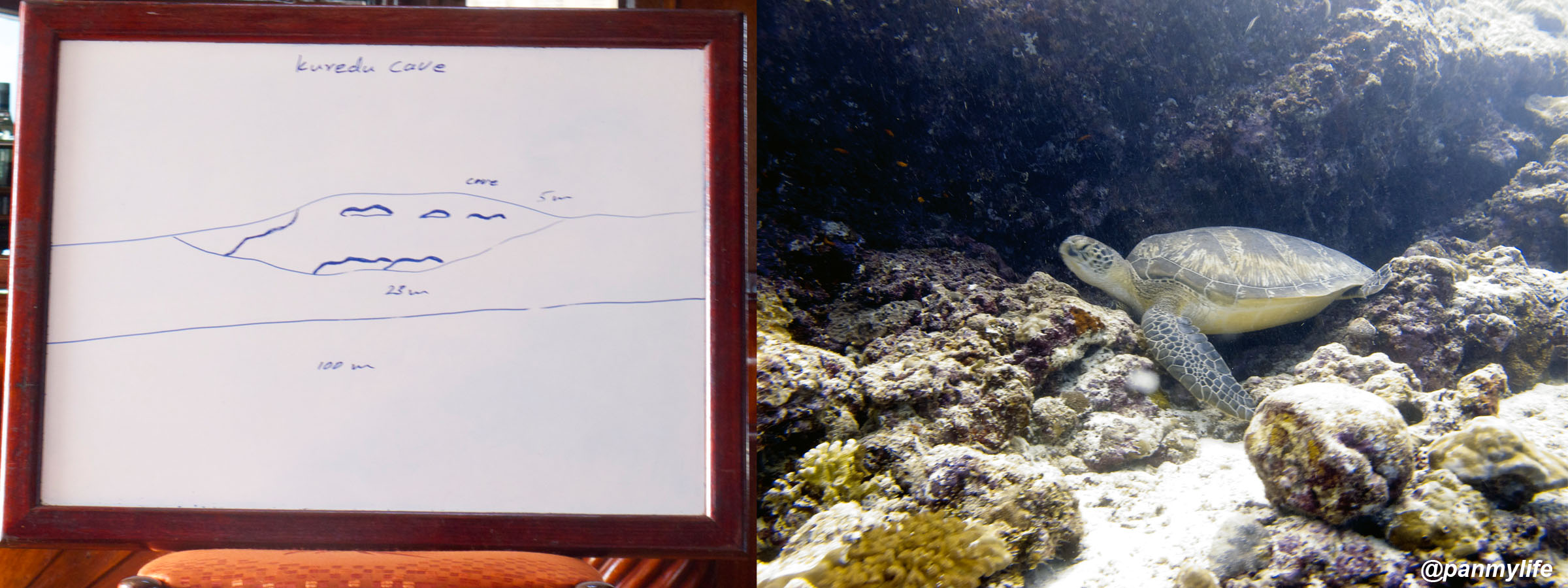 The second dive was my first this dive. It was like an underwater island. I had heard that the north of Maldives diving were mainly thila diving and most of them were pretty deep at around 15-20metres. Our check out thila was of course much shallower. But definitely more interesting than the first dive. 🙂 I found the side caves very interesting and apparently this was one of a feature of diving a thila.