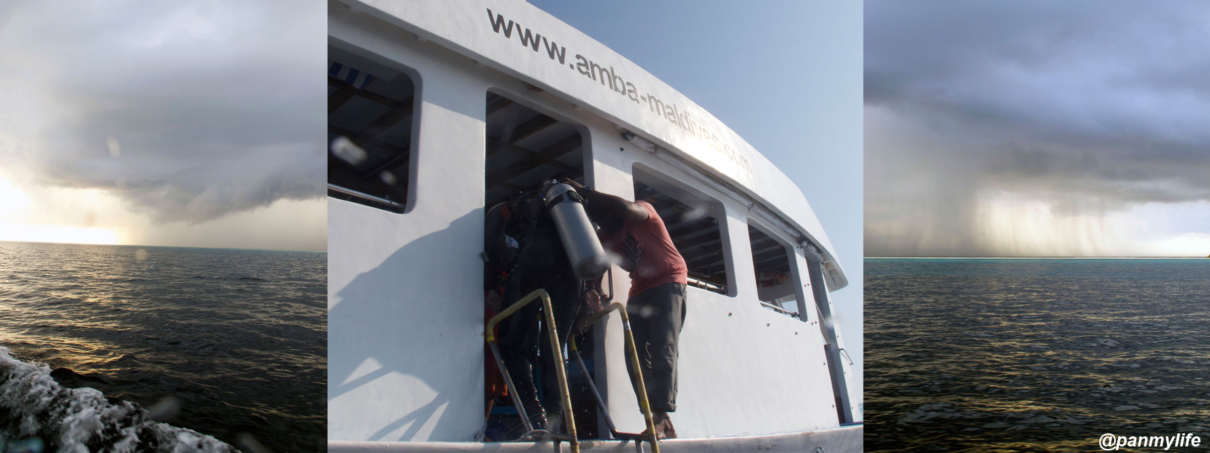 Waiting with me were a father and son diver team from Switzerland. I had a little problem communicating as they spoke French and only the father could speak a little English. But they were friendly and it wasn’t that bad a start. There also a couple of guys from Austria. We all got on the little boat where Captain handed us raincoats. I was a little puzzled but once the speedboat started moving, mystery solved. I was getting drenched from the waves.
