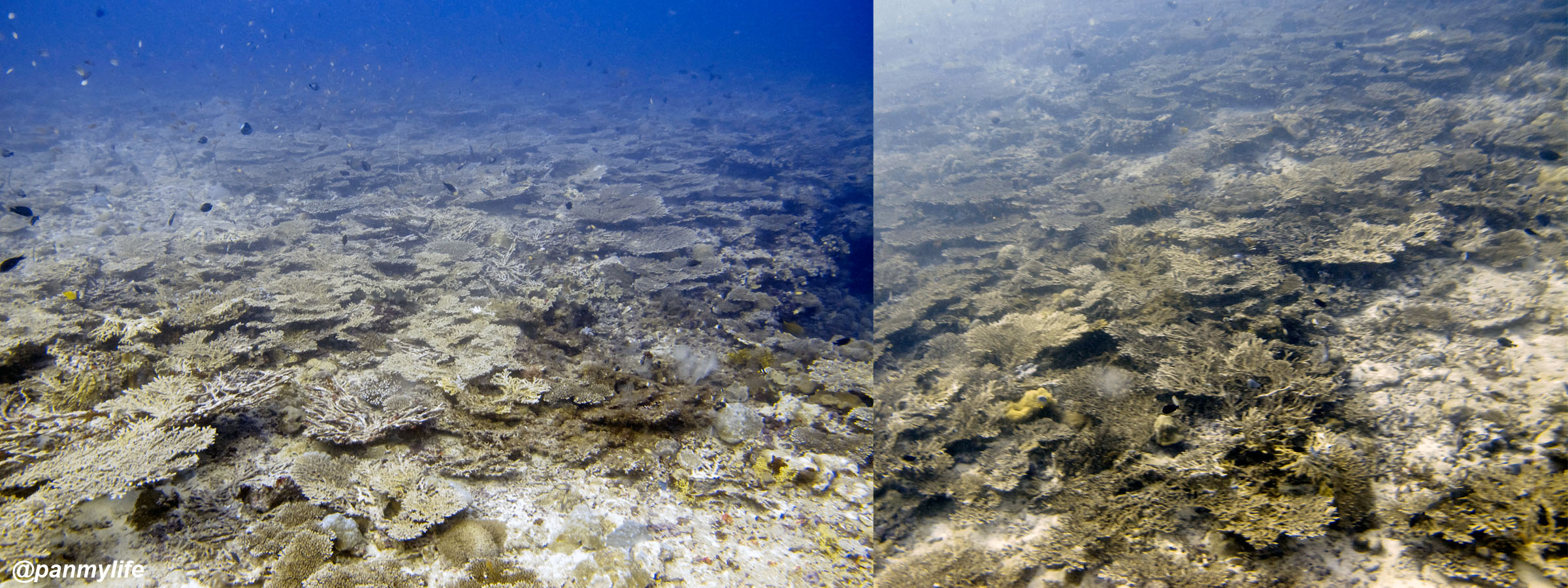 While the edges side walls were covered with soft ferns, the top of the thila were all covered with hard corals. Again that bleached look… hopefully this was really its natural colour.