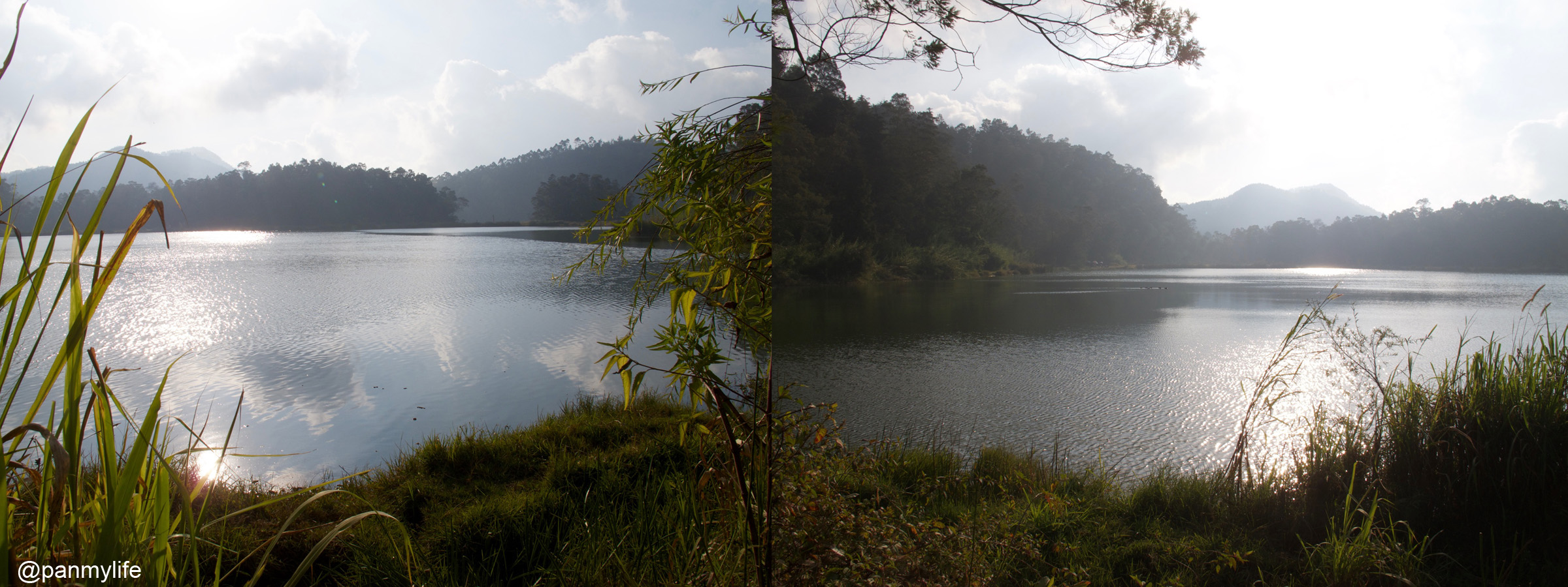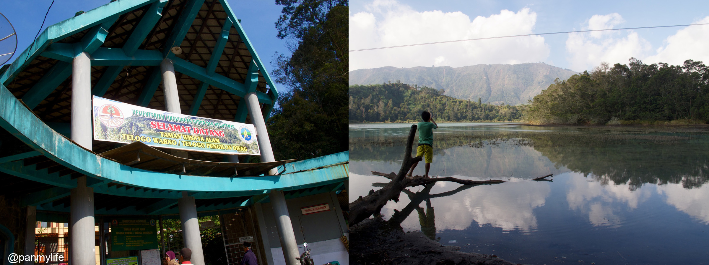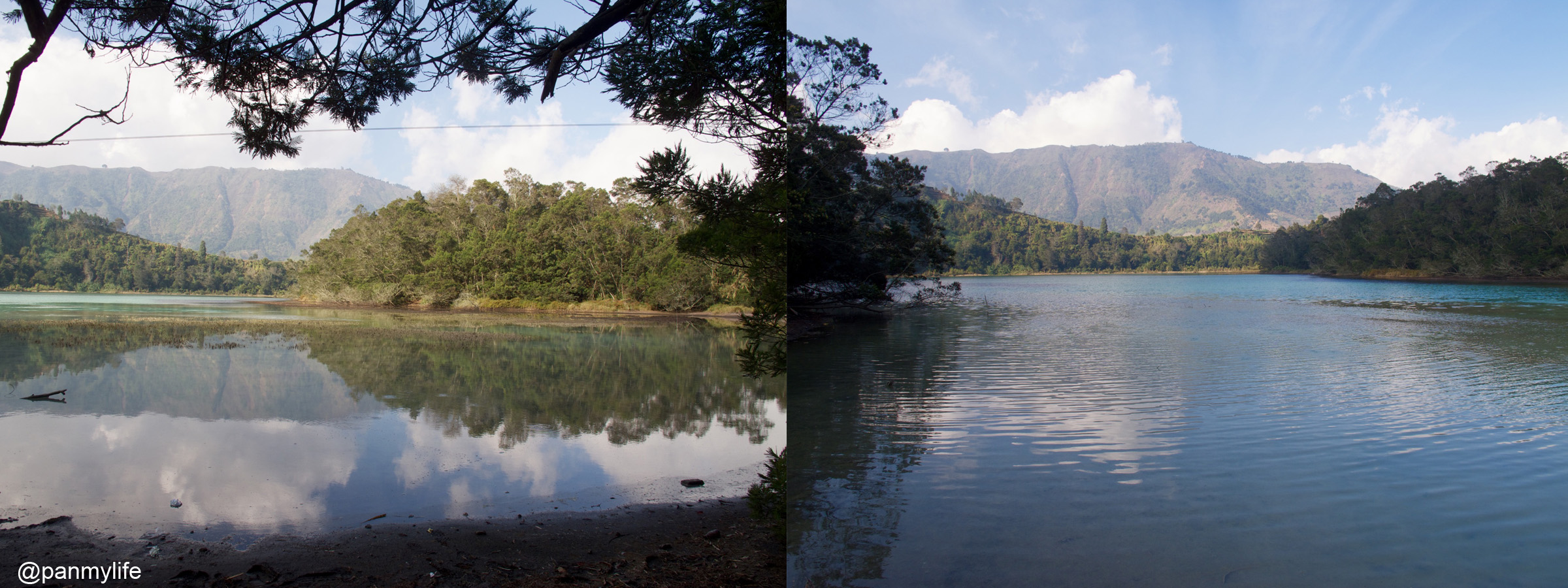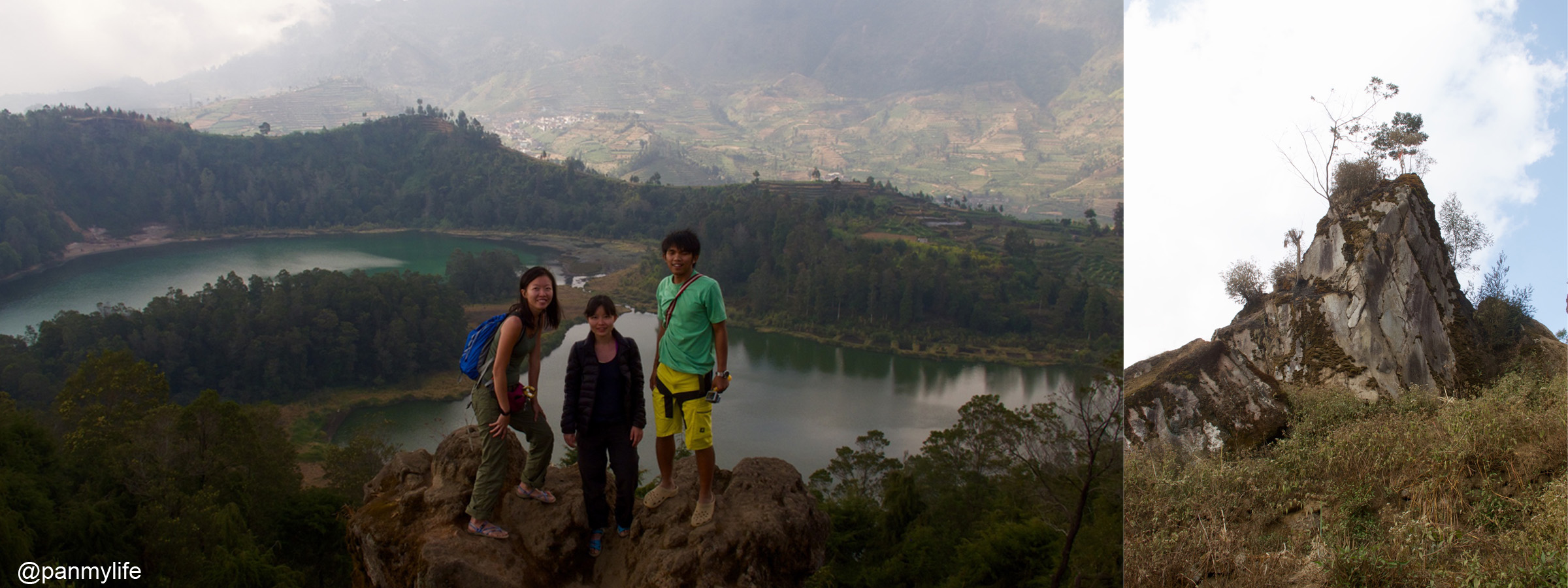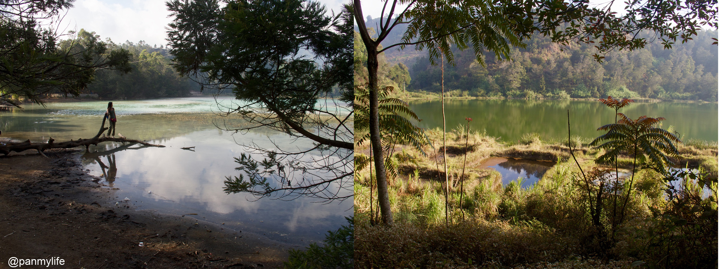 Whatever goes up must come down. So next stop, we headed to the lakes. It was crowded and Daniel had to queue for the tickets to get in. The lakes did not look that big from up there but right now, we were standing by the lake nearer the entrance and we could not see the adjoining lake. The branches falling over the lake reminded me of our campover at Semeru right next to the lake. Sara and I played models for Daniel on a very similar looking log.